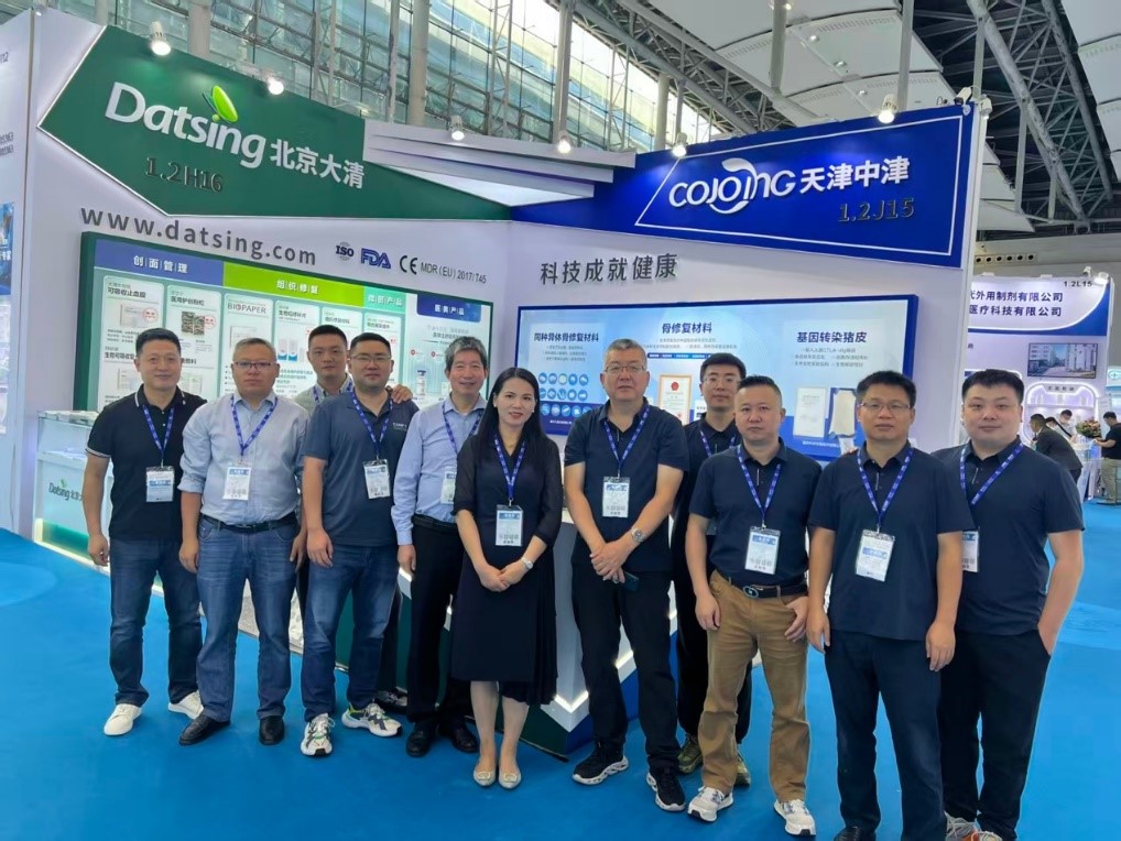 开展期间,大清生物展台始终人气旺盛。公司集中展示了四大产品线的创新成果:在医用耗材领域,展出大清生物纸、生物可吸收复合止血膜、医用护创粉等明星产品;在生物材料板块,推出生物疝修补片、组织修复材料、生物硬脑(脊)膜修补片等产品;在腔镜外科器材方面,呈现穿刺器、结扎夹等专业器械;此外,修复液体敷料、壳聚糖精华液等多款即将上市的新品也首次亮相。同时,公司推出的壳聚糖原料定制服务,更是引发业内广泛关注。